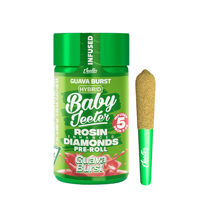 Guava Burst Rosin Enhanced Pre Rolls by Baby Jeeter bring tropical flavor and balanced hybrid effects. Includes 5 potent rosin-infused mini prerolls.